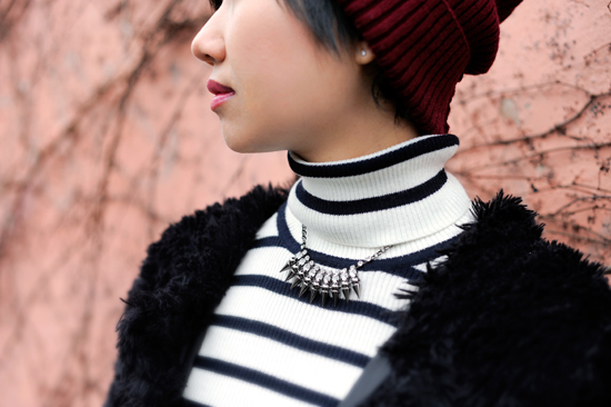 Hence I have tested this first association with a relatively dark look, while playing with the materials: leather, faux-fur and, just so it doesn’t get boring, by spicing it all up with stripes and my burgundy beanie-chéri. This wool striped turtleneck sweater is by the way my best sales bargain since I only paid it 25 cents!