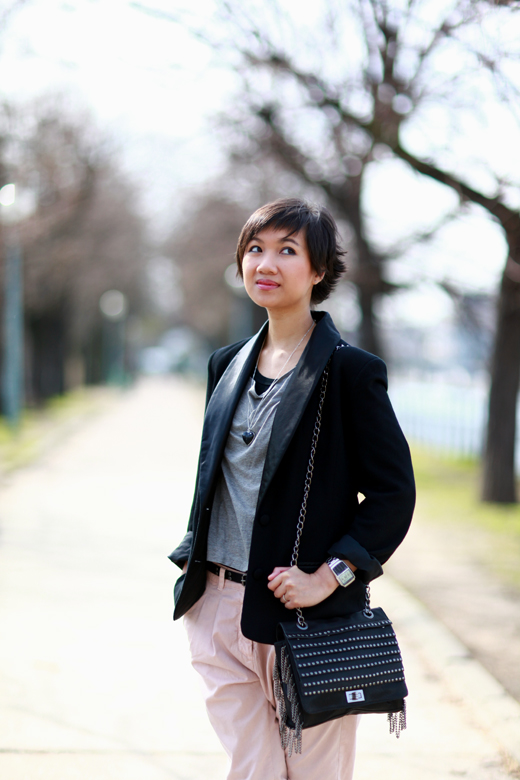 Sympa cette tenue, j’aime beaucoup le mélange du gris et du rose poudré, rehaussé par une touche de noir. C’est juste top !