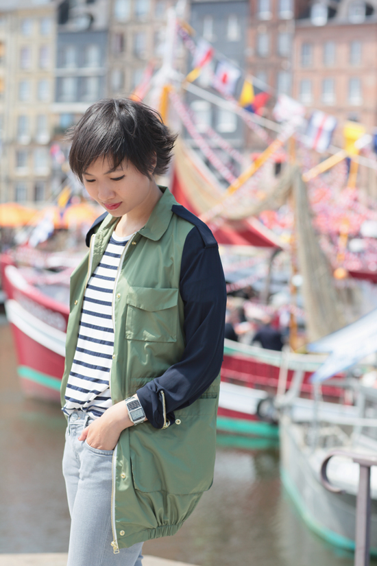 J’adore Honfleur ! Ta tenue est très chouette, la veste est très jolie.