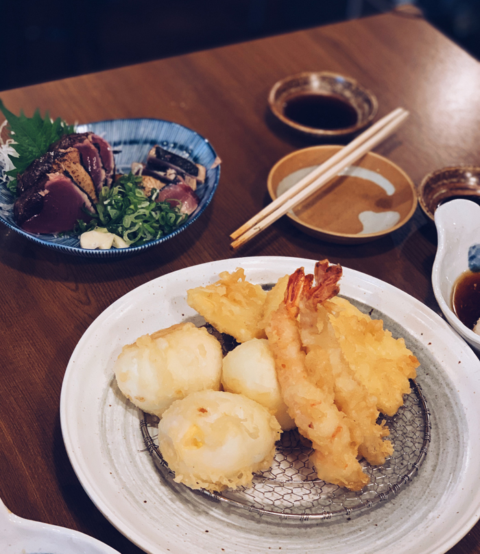 Tempuras aux crevettes et oeuf coulant, tataki de bonite